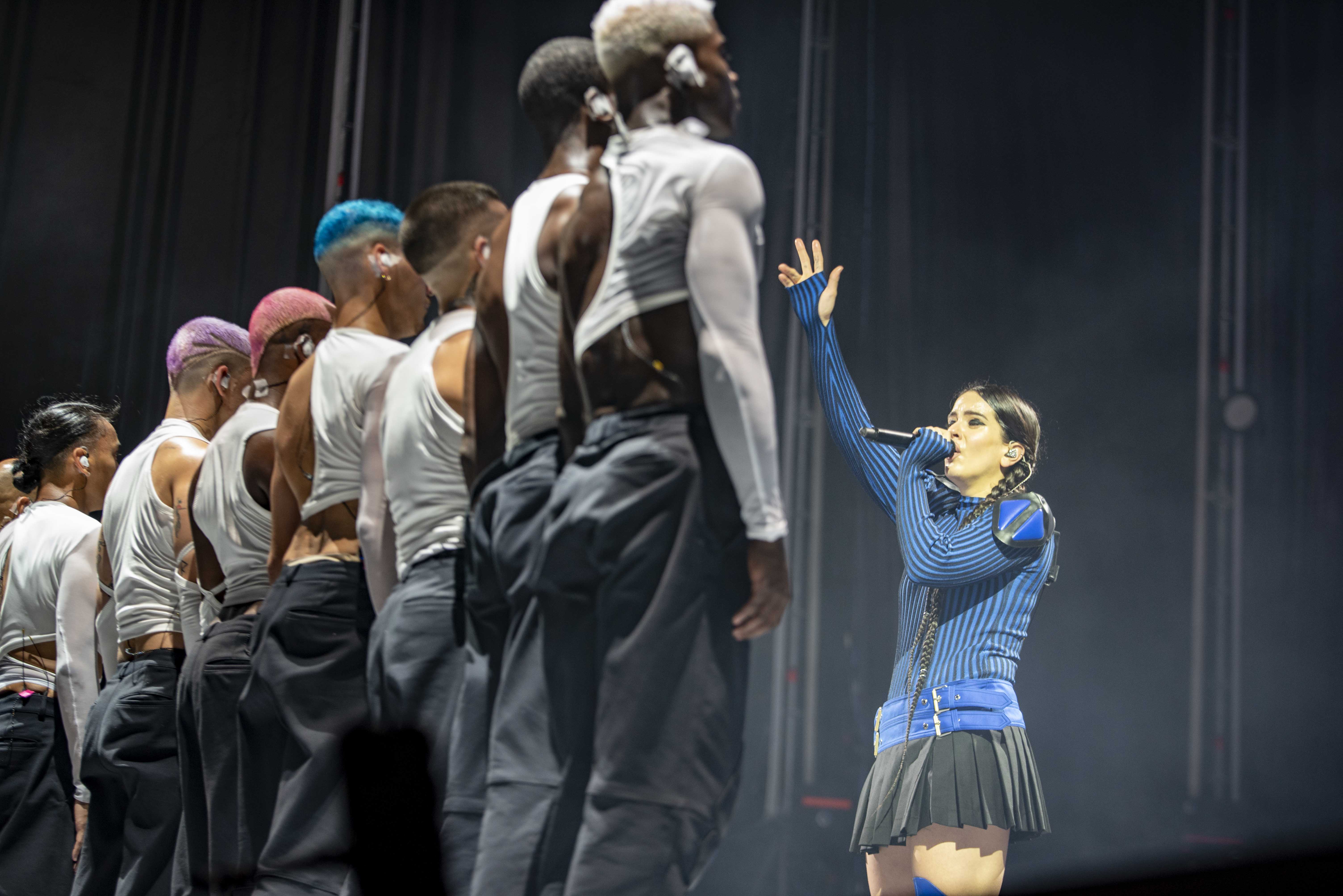 Tras un rugido de motores, el cuerpo de baile de Rosalía, formado por una decena de bailarines, a diferencia de la gira anterior, que eran chicas, aparece ataviado con cascos luminosos y actitud desafiante y guerrera, como si se tratara de un atávico ritual o de la llegada de seres de otro mundo. De entre ellos, cual ‘madre de dragones’ liderando al clan, aparecerá Rosalía con un atuendo colegial que no abandonará en todo el concierto, pese a los rigores de la exigencia física sumado a los calores estivales.